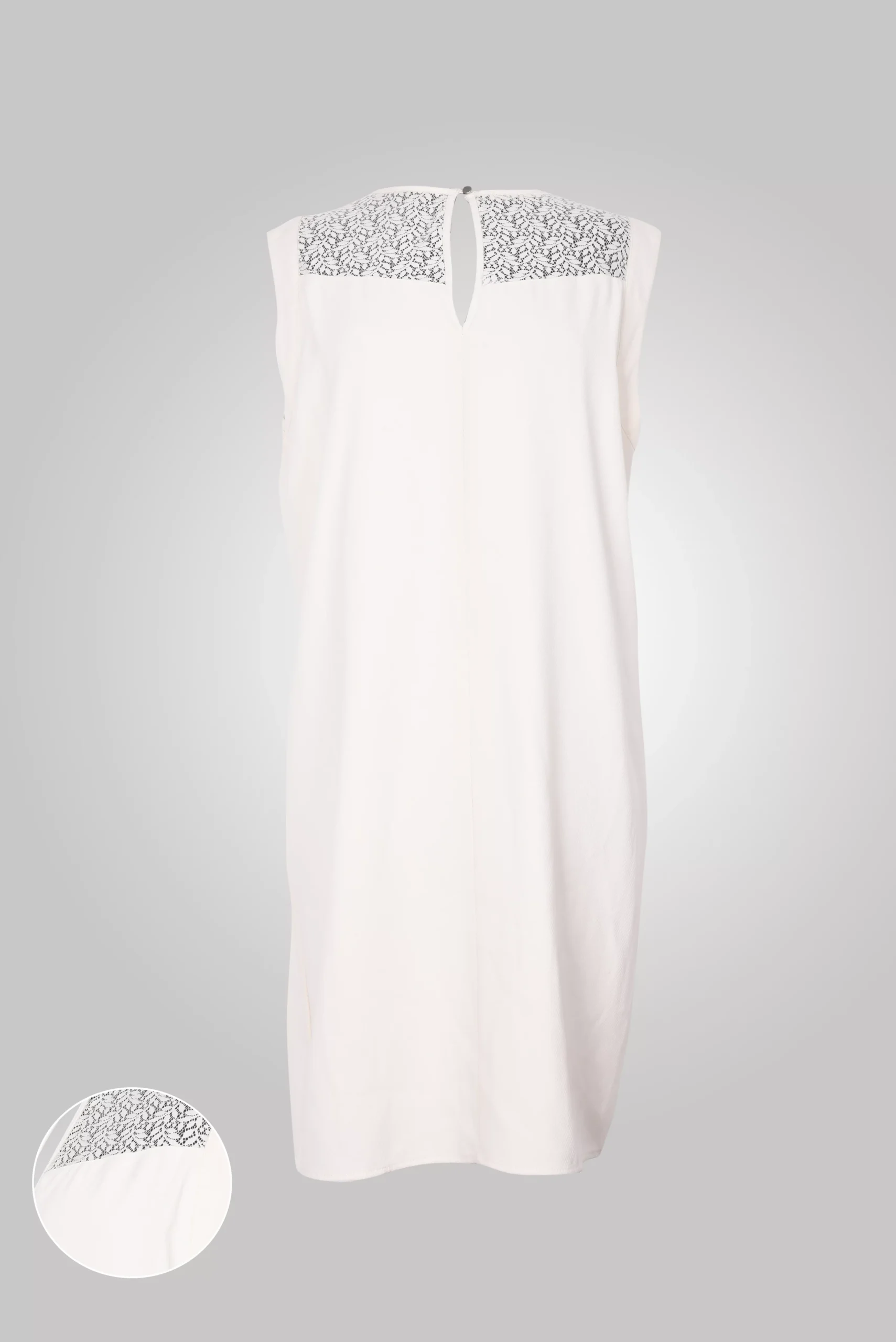 Sleeveless knee-length dress with a delicate lace panel at the neckline.